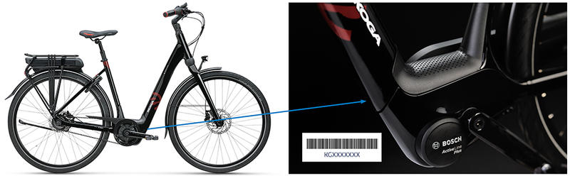 Ob der Rahmen Ihres Fahrrads extra verstärkt werden muss, lässt sich leicht prüfen. Über die Website www.checkjeframenummer.nl/de können Sie Ihre Rahmennummer kontrollieren. Der Aufkleber, auf dem der Strichcode und die Rahmennummer angegeben sind, befindet sich auf dem Unterrohr beim Motor. Die Nummer besteht aus vier Buchstaben (beginnend mit KGB) und fünf Ziffern, wie auf dem Foto unten zu sehen.